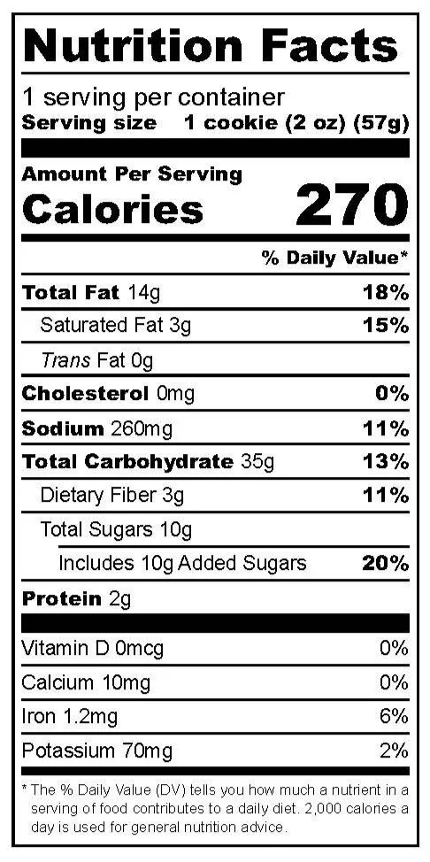 INGREDIENTS: GLUTEN FREE FLOUR BLEND (OAT FLOUR, WHITE RICE FLOUR, POTATO STARCH), HIGH OLEIC SUNFLOWER OIL, TAPIOCA SYRUP, CHOCOLATE CHIPS (CANE SUGAR, COCOA PASTE, COCOA BUTTER), CANE SUGAR, COCOA POWDER, LESS THAN 2% OF: SODIUM BICARBONATE, CORN STARCH, MONOCALCIUM PHOSPHATE, NATURAL FLAVOR, SALT, SUNFLOWER LECITHIN, XANTHAN GUM